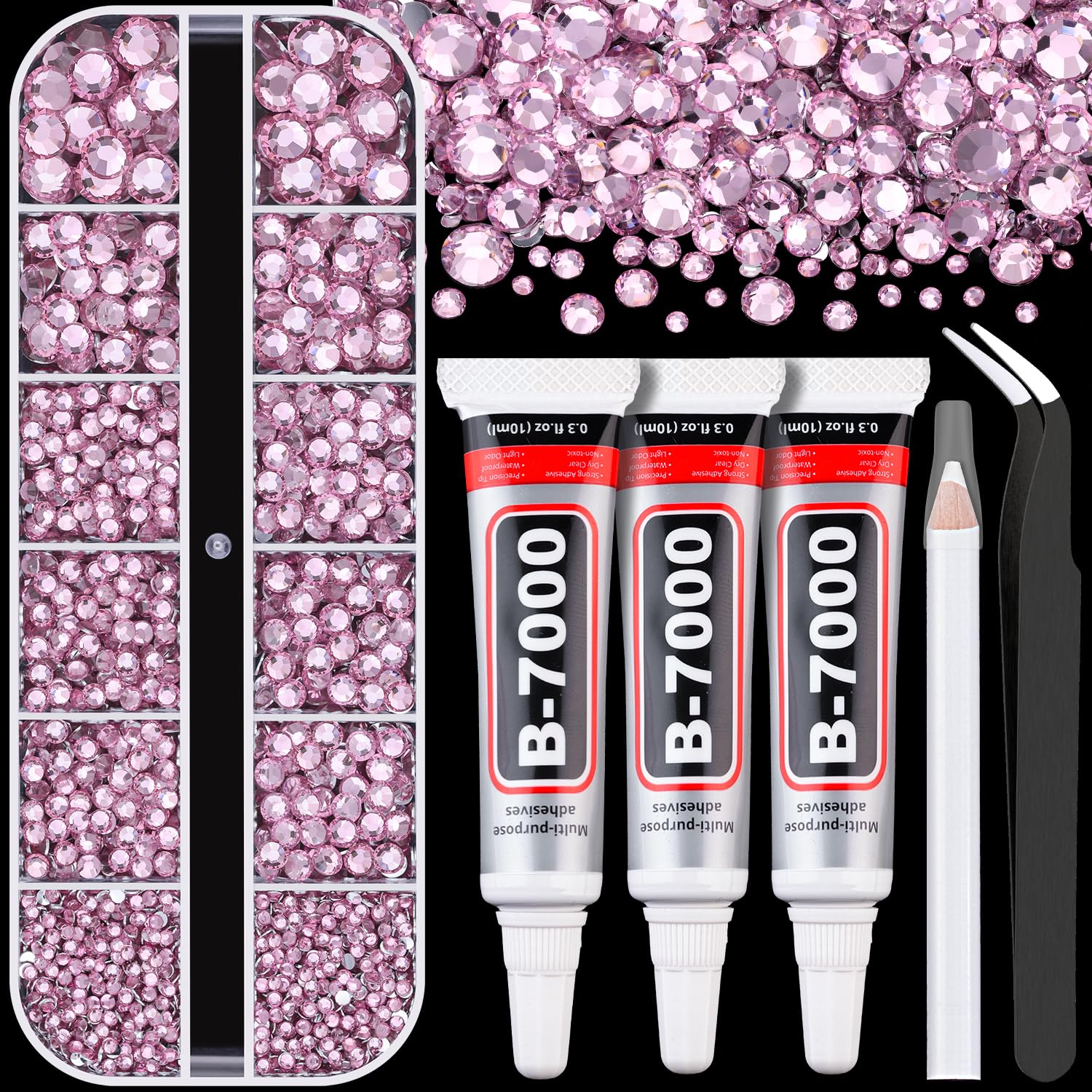 Resin Rhinestones for Crafting 1 Box Light Pink Flatback Crystals with 3 Pcs 10ml B7000 Jewelry Glue, Non-Hotfix Gems for Bedazzling, DIY Nail Art Makeup, Clothing & Shoes Decor