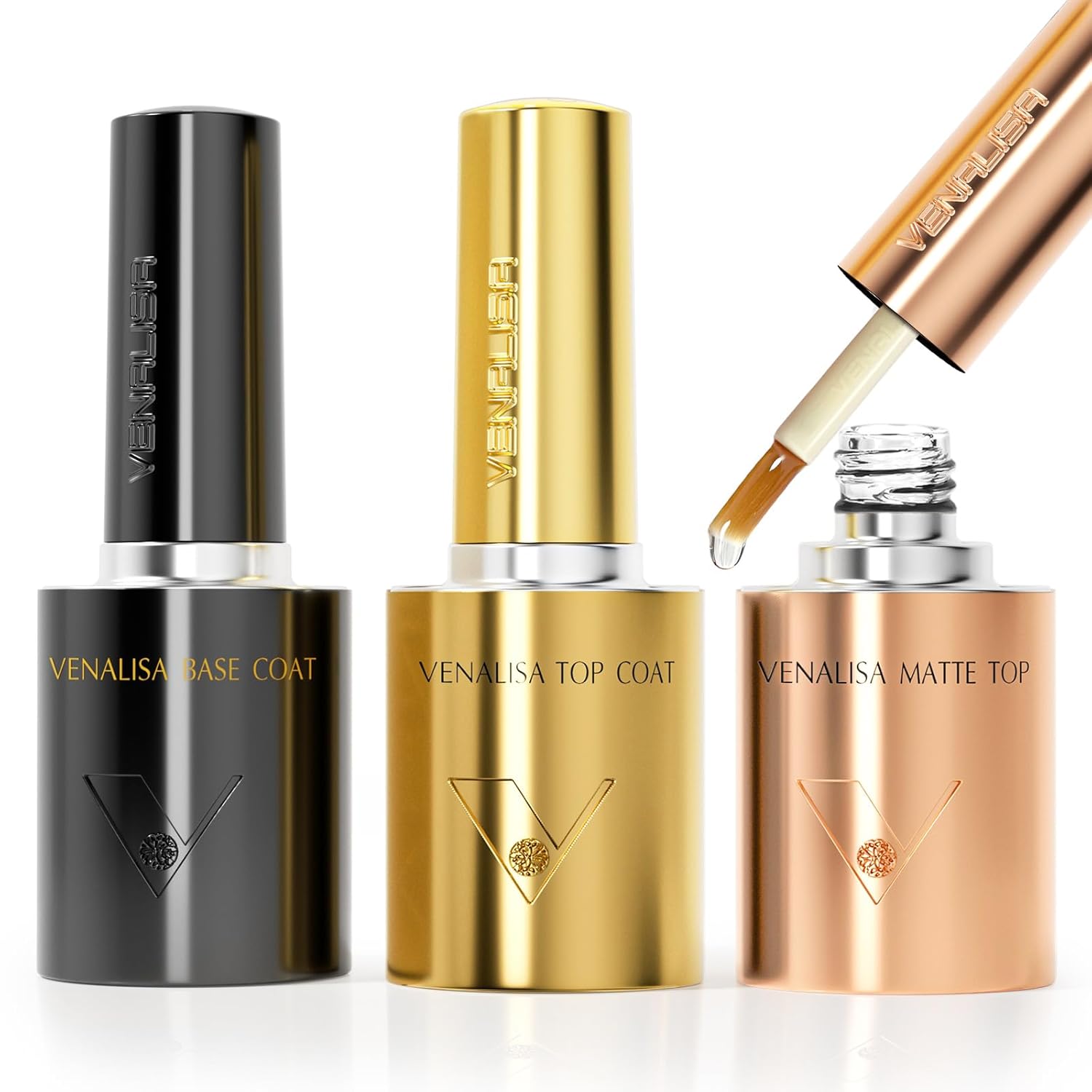 VENALISA 3 Pcs No Wipe Glossy and Matte Gel Top Coat and Base Coat Set for Gel Nail Polish- High Gloss Base Matte & Shiny Top Coat Kit, Soak Off Nail Art Home and Professional Manicure