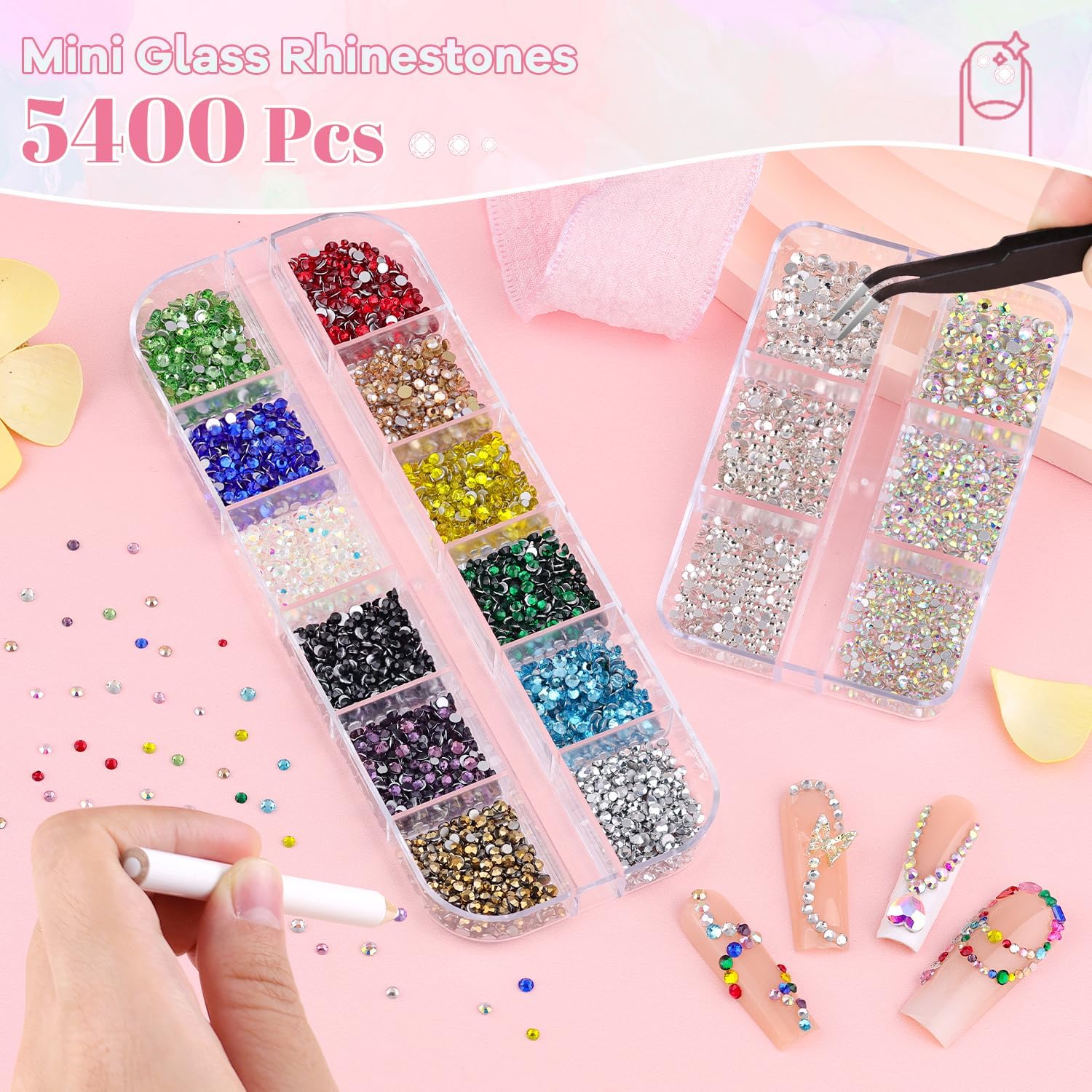 5400Pcs Glass Crystal Small Rhinestones for Nail Art, Tiny AB Clear Colorful Rhinestone Flatback Bedazzling Gems, Nail Rhinestones and Gems Crystals Charms for Acrylic Tips Manicure Decor