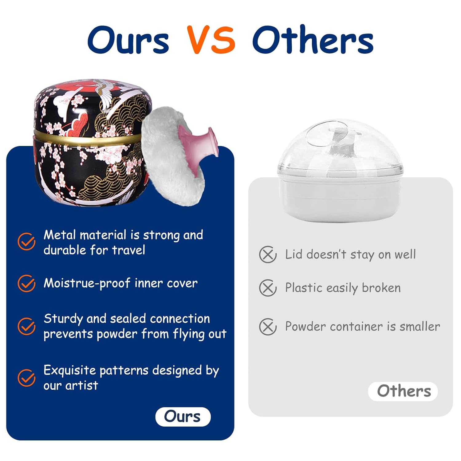 - GORGEOUS POWDER BOX: our powder case is made of tinplate, not easy to break and fade after being dropped, also can be used for a long time. the surface of the powder container has exquisite patterns designed by our artist, bring visual enjoyment.