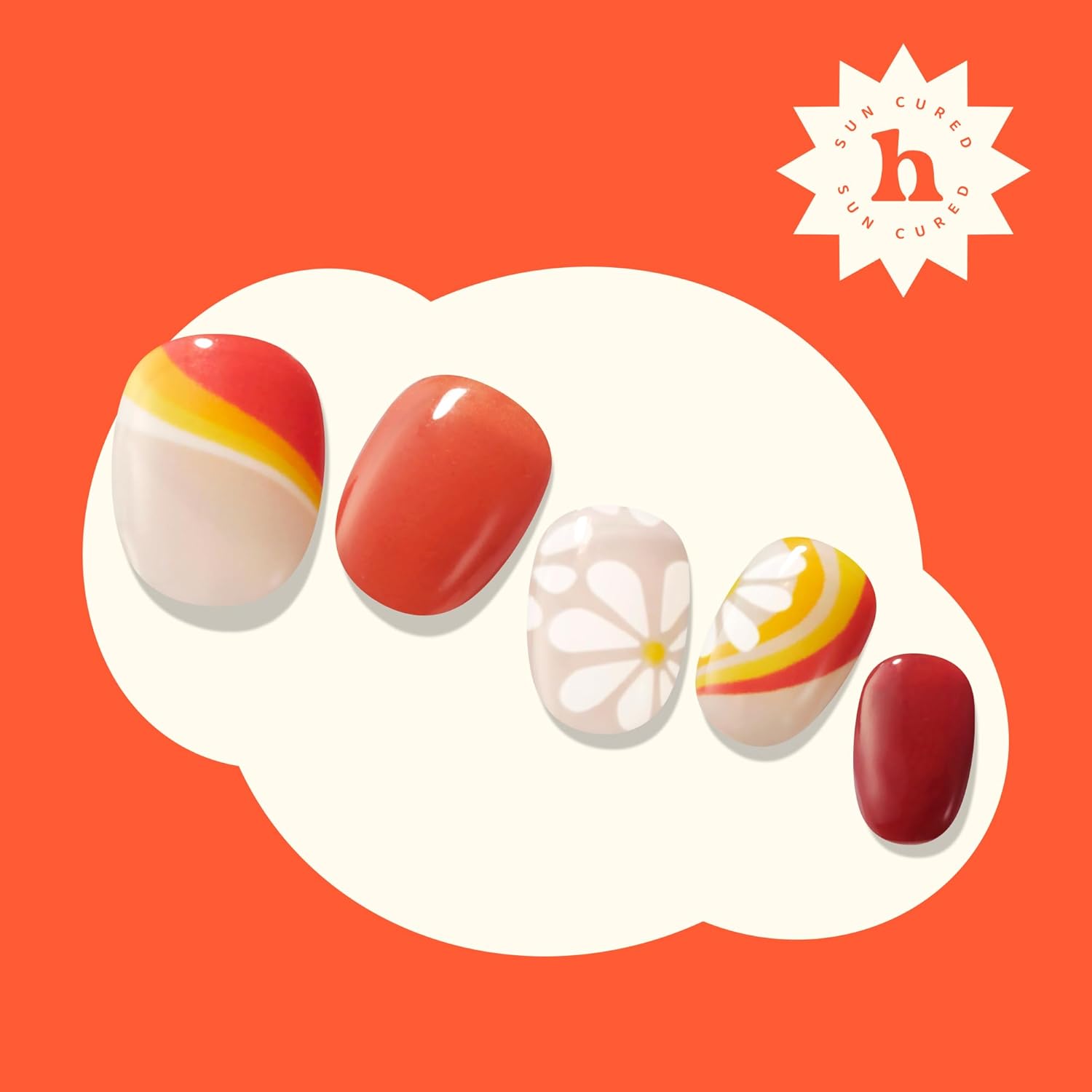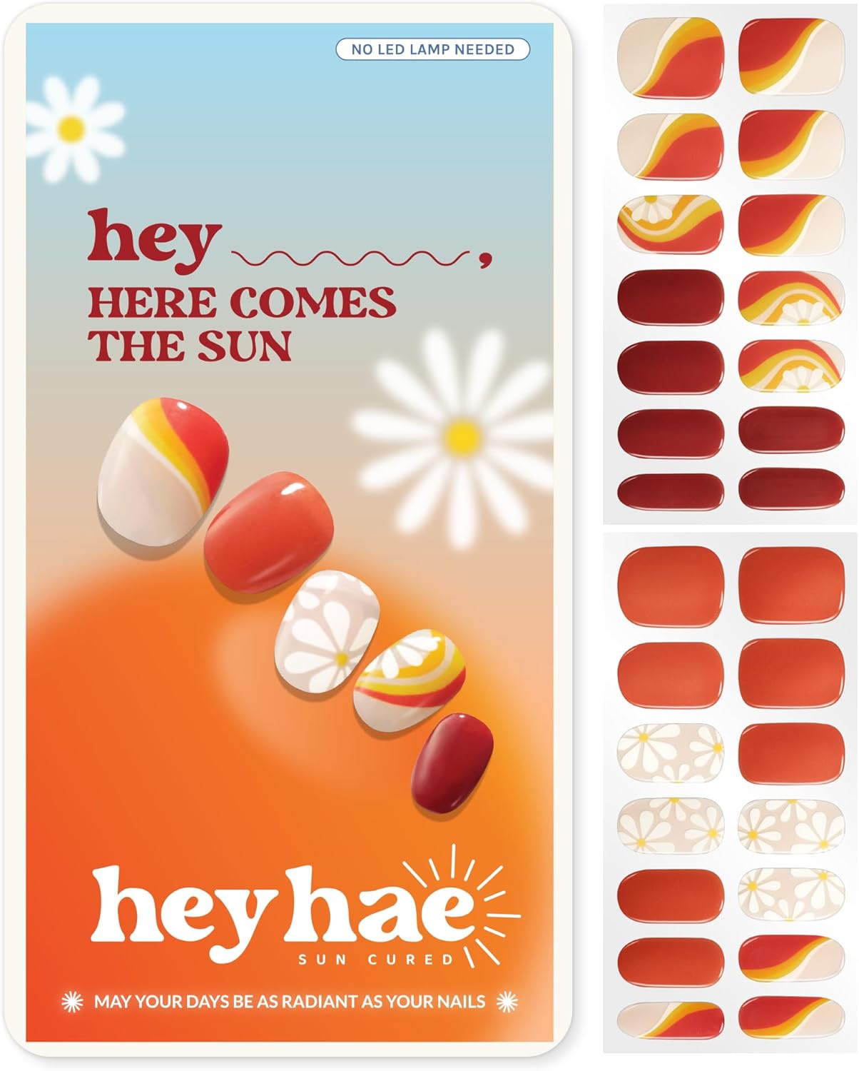 Semi Cured Gel Nail Strips | No LED Lamp Needed | Summer, Floral, Red | Easy Apply & Remove, Salon Quality | Includes 28 Strips, 1 Prep Pads, Nail File & Wooden Stick - Hey, Here Comes The Sun