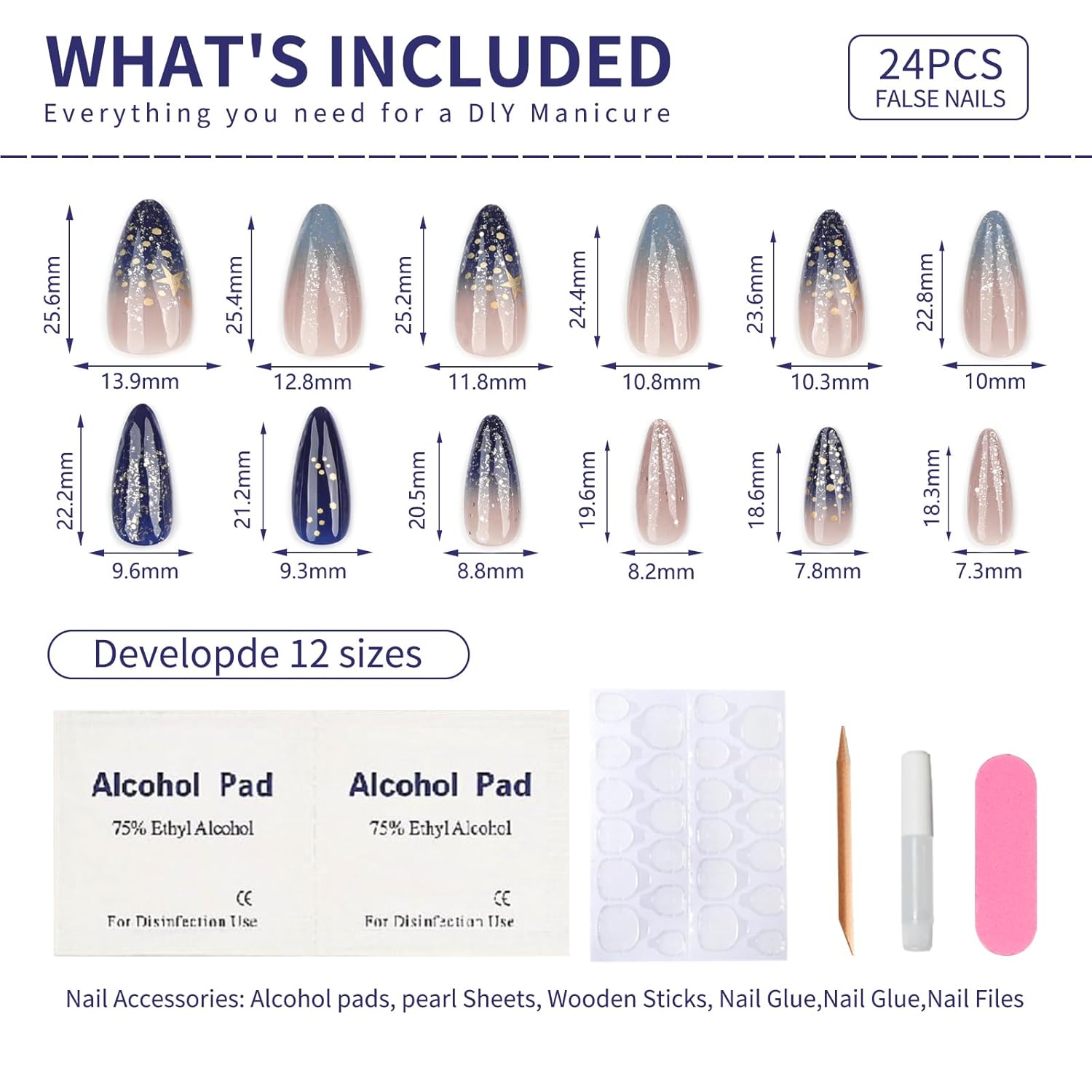 - Package Includes: 24 pcs stick on false glue on nails kit, each box includes 24 short press on nails, 1 sheet of 24 sticky nail pieces, 1 cuticle stick, 1 double sided nail file and gel press on nails cleaning pads, a small tube of nail glue,All the tools you need to apply the nails are included in one set