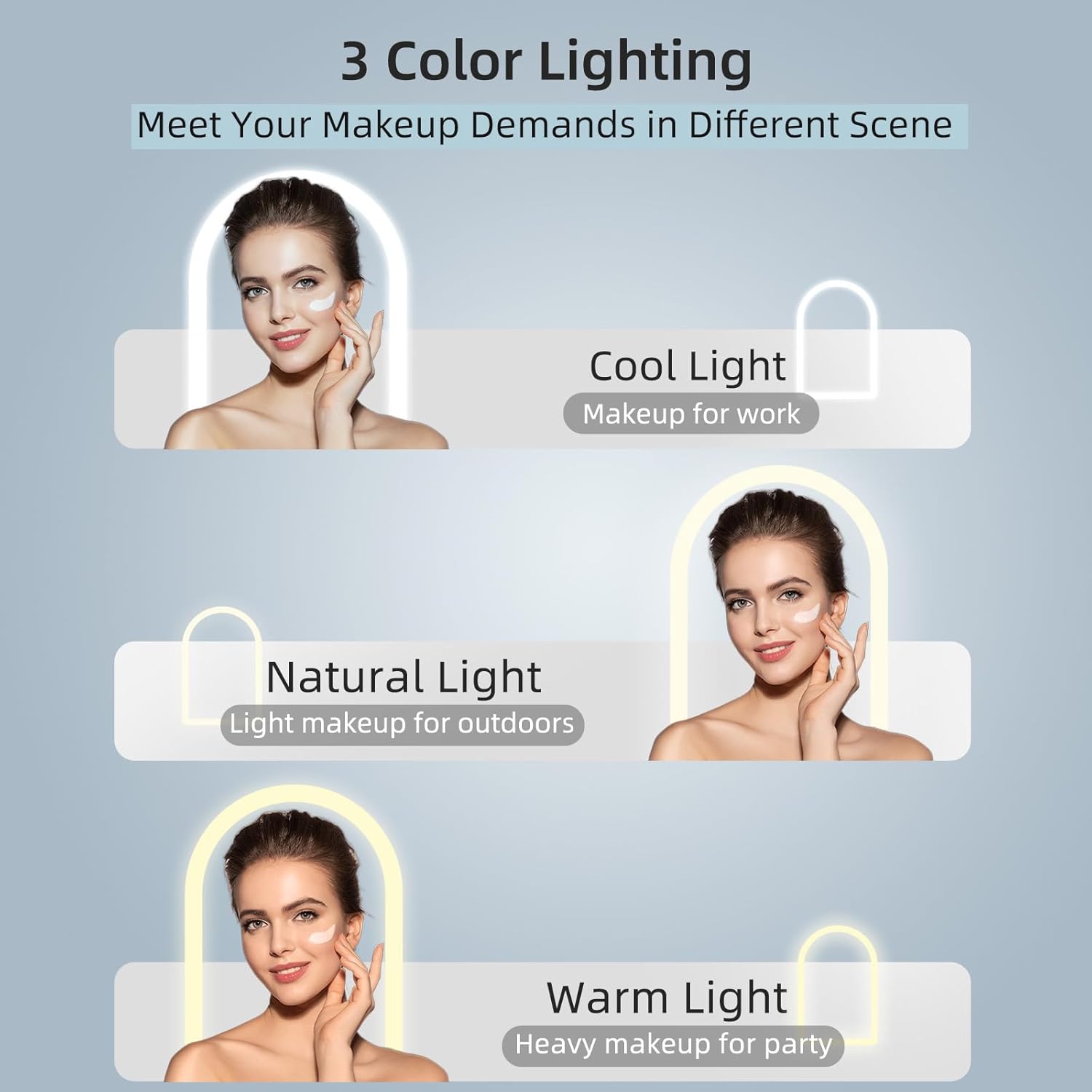 - Travel Size Makeup Mirror:This portable rechargeable mirror in arch design with lights is 5.1*8IN 400g,just a ultra-thin Ipad Mini Size.Easily fits in travel bag, and is an ideal portable makeup Mirror for travel.Just take it easy on the go