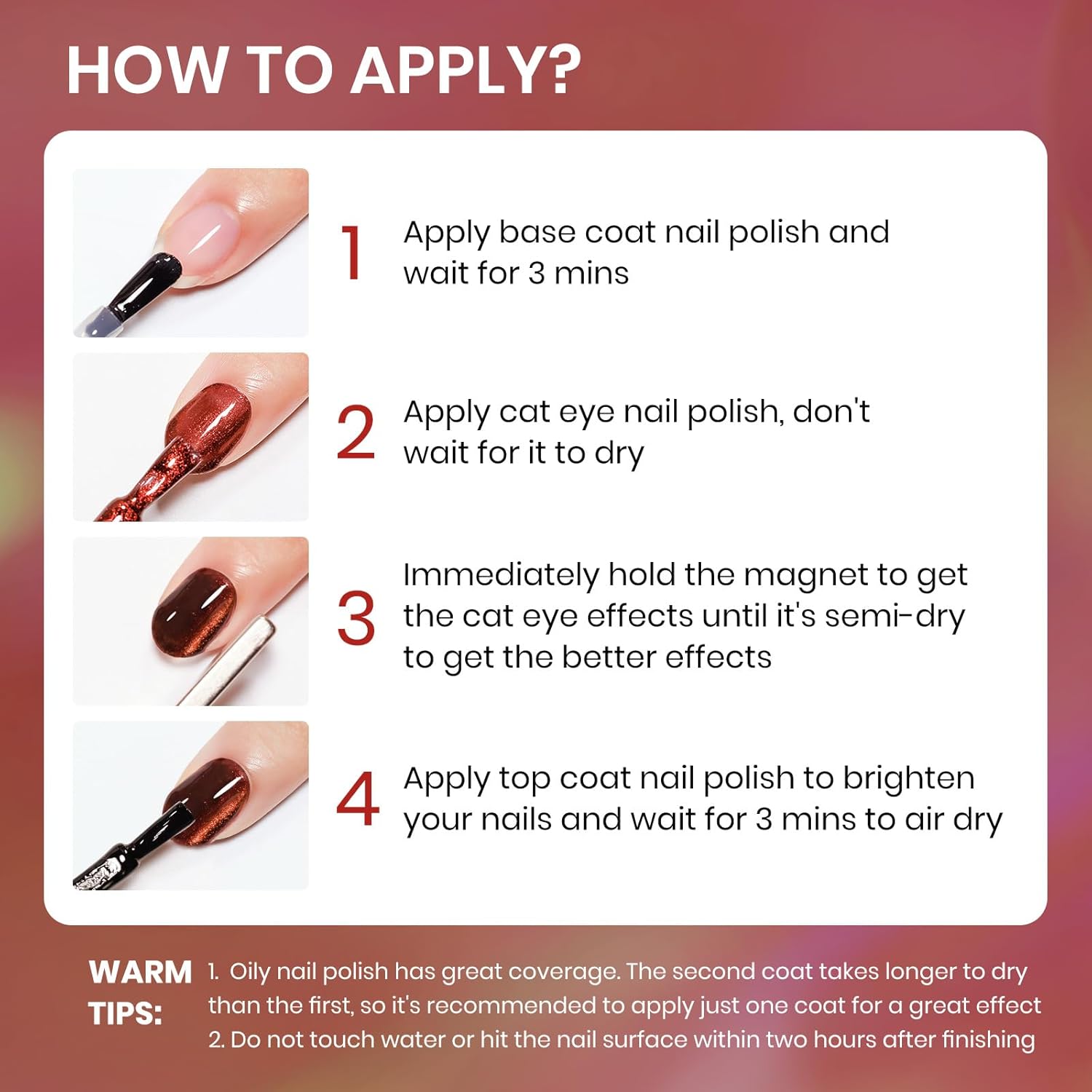 - Important Tips: 1. When the nail polish is not dry yet, it will be fluid. Use magnets to hold it in place until it's semi-dry, then take them off for a sharp cat-eye look 2. Do not touch water or hit the nail surface within two hours after finishing to avoid peeling; 3. Base and top coat nail polish art necessary