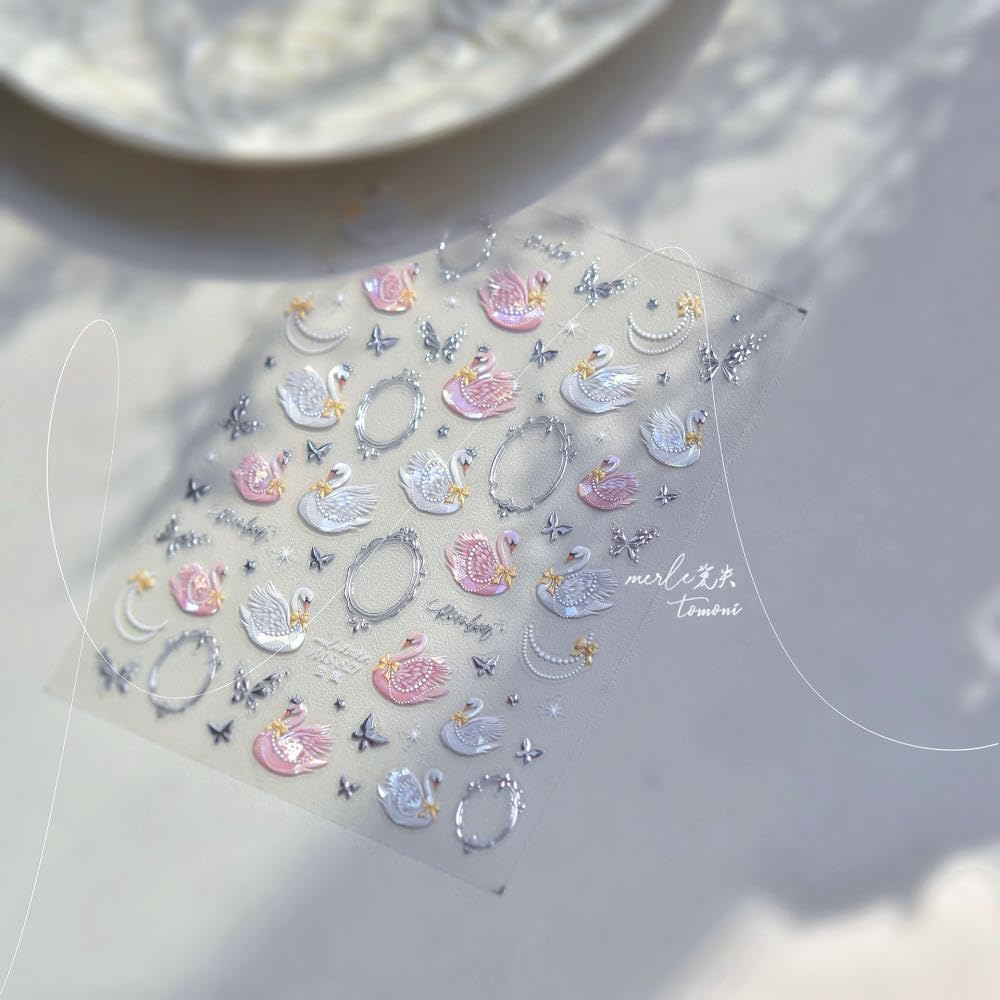 1 Sheet Swan Nail Stickers 5D Embossed Pink Animal Print Nail Art Stickers Self-Adhesive Yellow Bow Nail Decals Silver Butterfly Nail Designs Pearl Frame Nail Art Decoration for Women Manicure