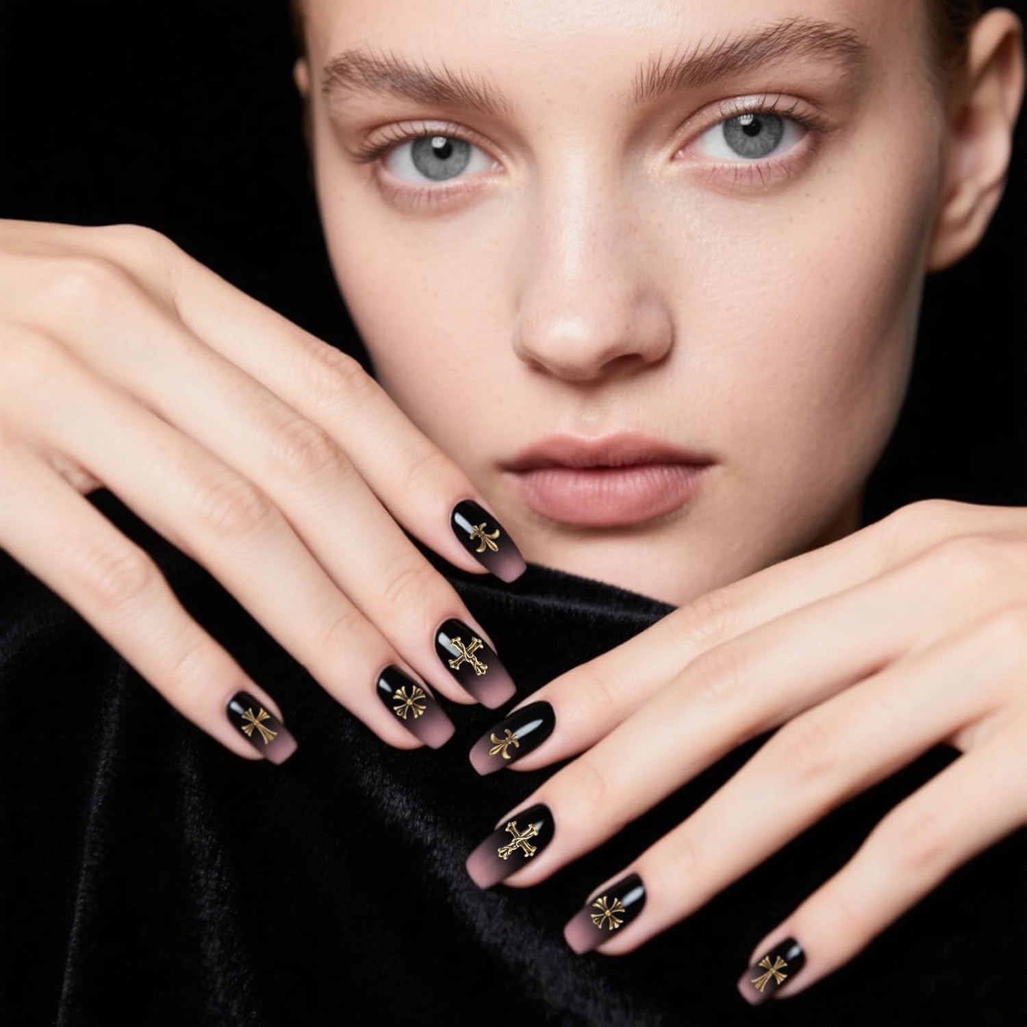 - How to use: Clean your nails, add a base coat, place the cross gems for nails