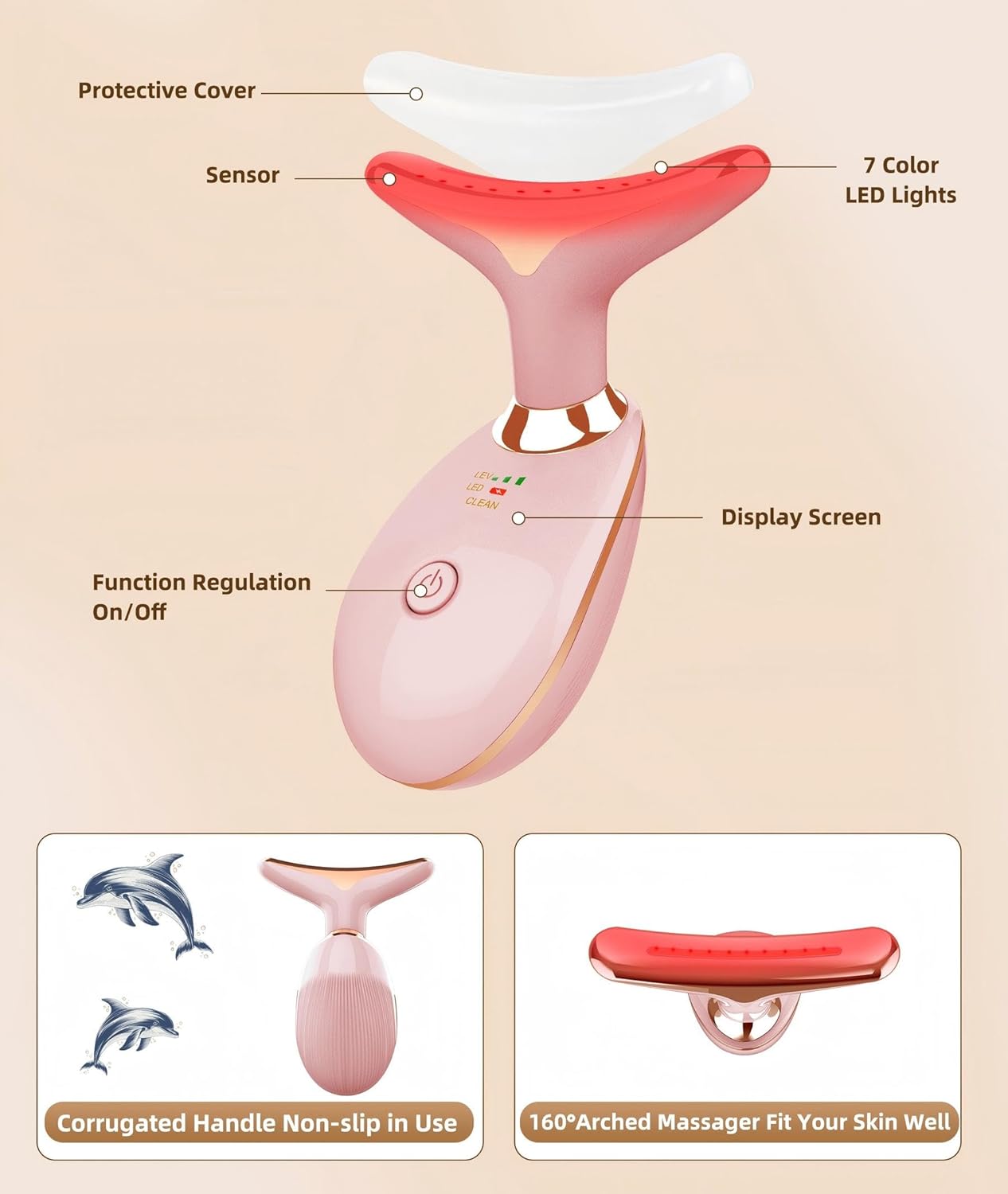 7 Color Face and Neck Massager Light Therapy, Red Light Based Facial Massager for Skin Care, Firming, Smoothing (Rose Golden)