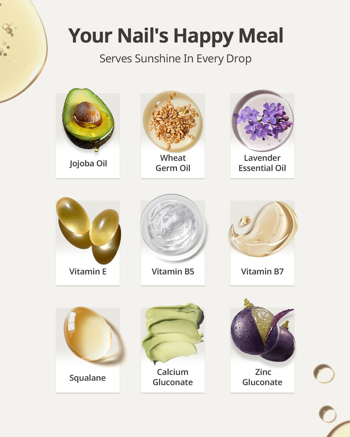 - YOUR NAIL'S HAPPY MEAL:Formulated with 10+ plant oils and vitamins - Jojoba Oil/Wheat Germ Oil/Lavender Oil/Vitamin E/Vitamin B5/Vitamin B7/Squalane. Healthy organic formula and non-toxic to the body.