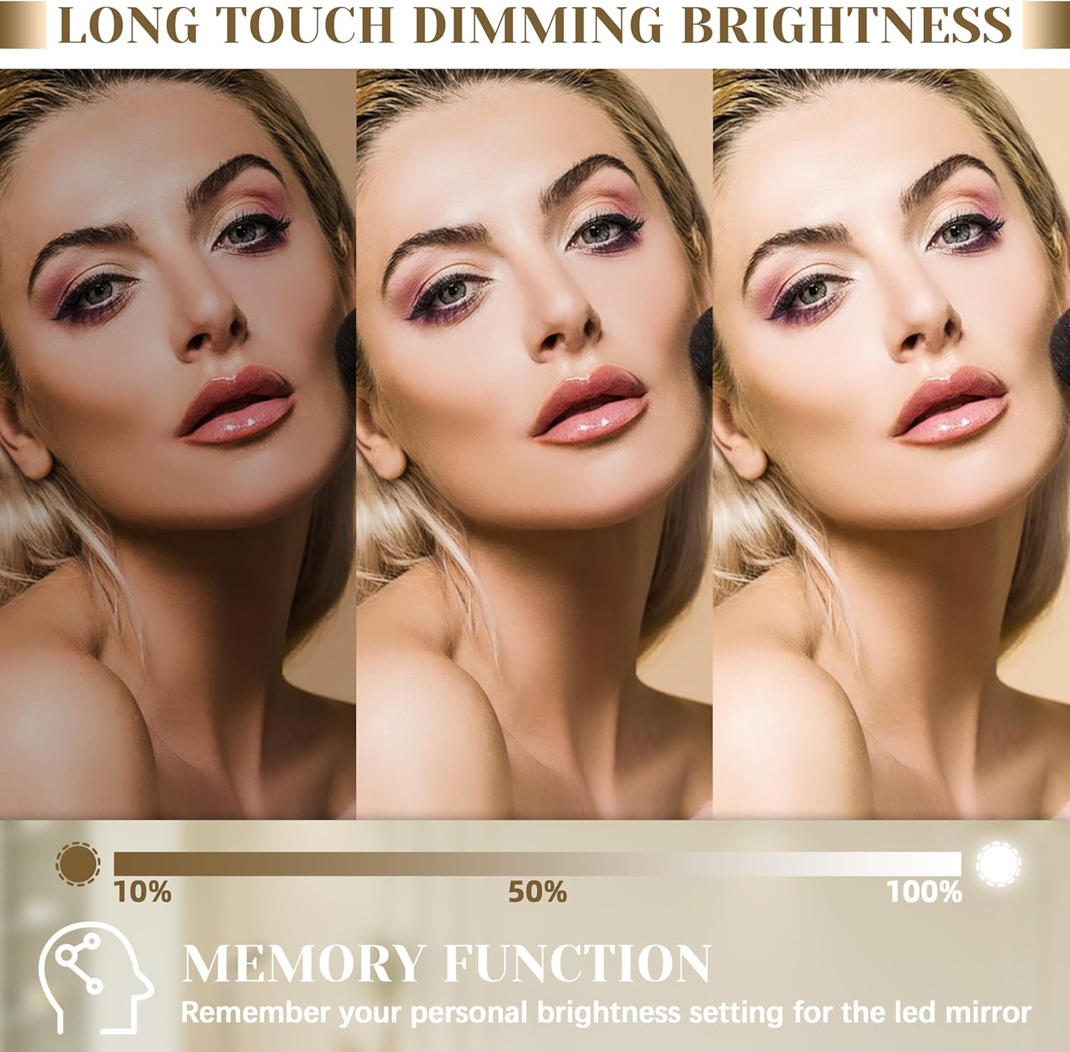 - 【3 Light Modes & Smart Dimming】 Switch between warm light, natural daylight, and cool white light to match any scenario—morning routines, evening events, or studio-style makeup. Adjust brightness with a simple touch to achieve flawless lighting for every look. Whether you're contouring, applying eyeliner, or checking skincare, the dimmable feature ensures optimal visibility.