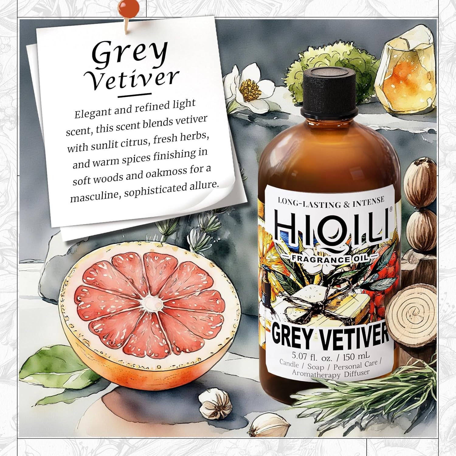HIQILI Grey Vetiver Fragrance Oil - Perfect for DIY Candle, Soap & Air Freshening Spray Making, and Home Essential Oil Diffuser - 5.07 Fl Oz