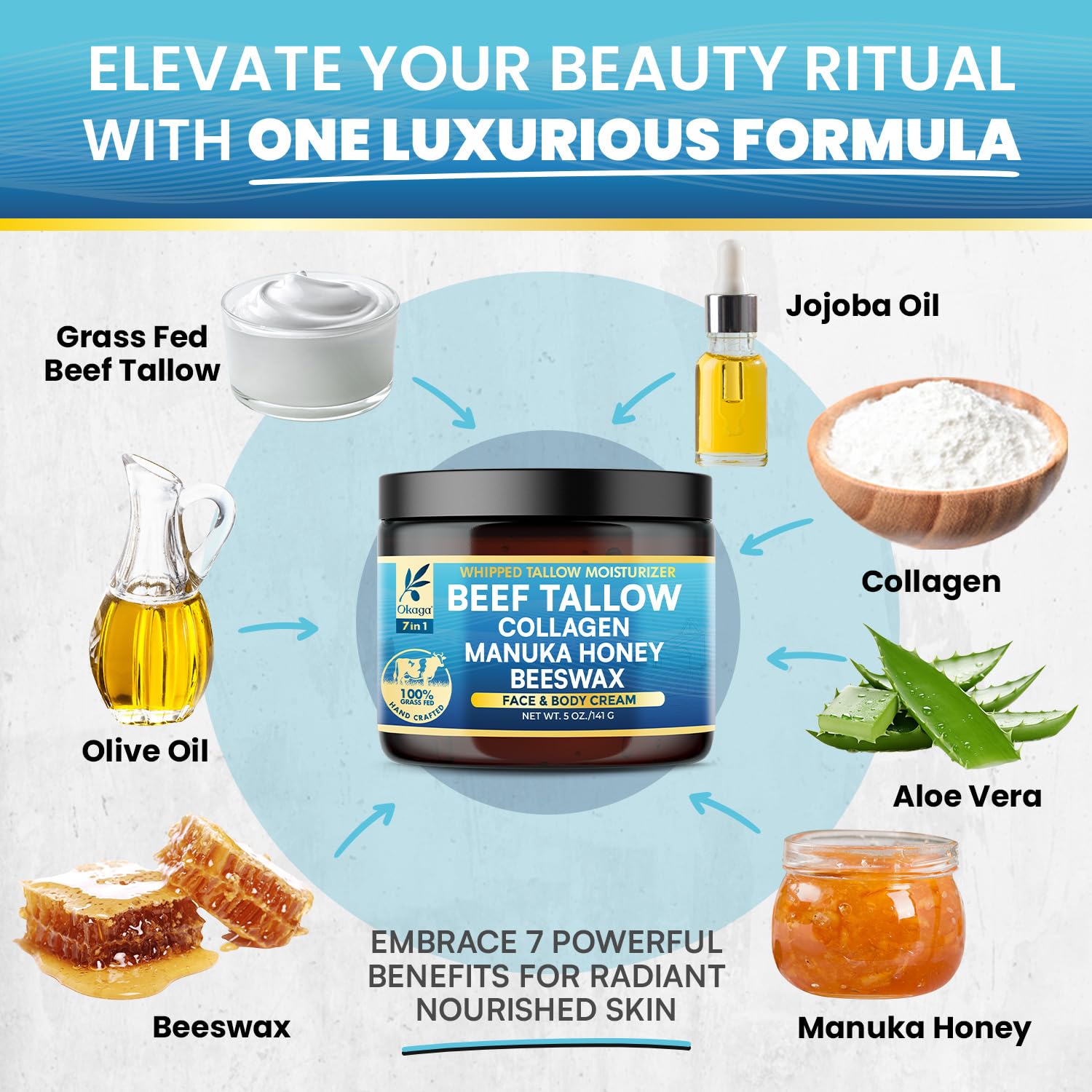 - Multi-Purpose Daily Moisturizer: Designed for all skin types, Okaga Beef Tallow Balm can be used as a daily facial moisturizer, nourishing body lotion, or soothing lip balm. Free from harsh chemicals and synthetic additives, this gentle yet effective formula keeps your skin feeling soft, hydrated, and comfortable, making it an essential, versatile part of your daily skincare routine.
