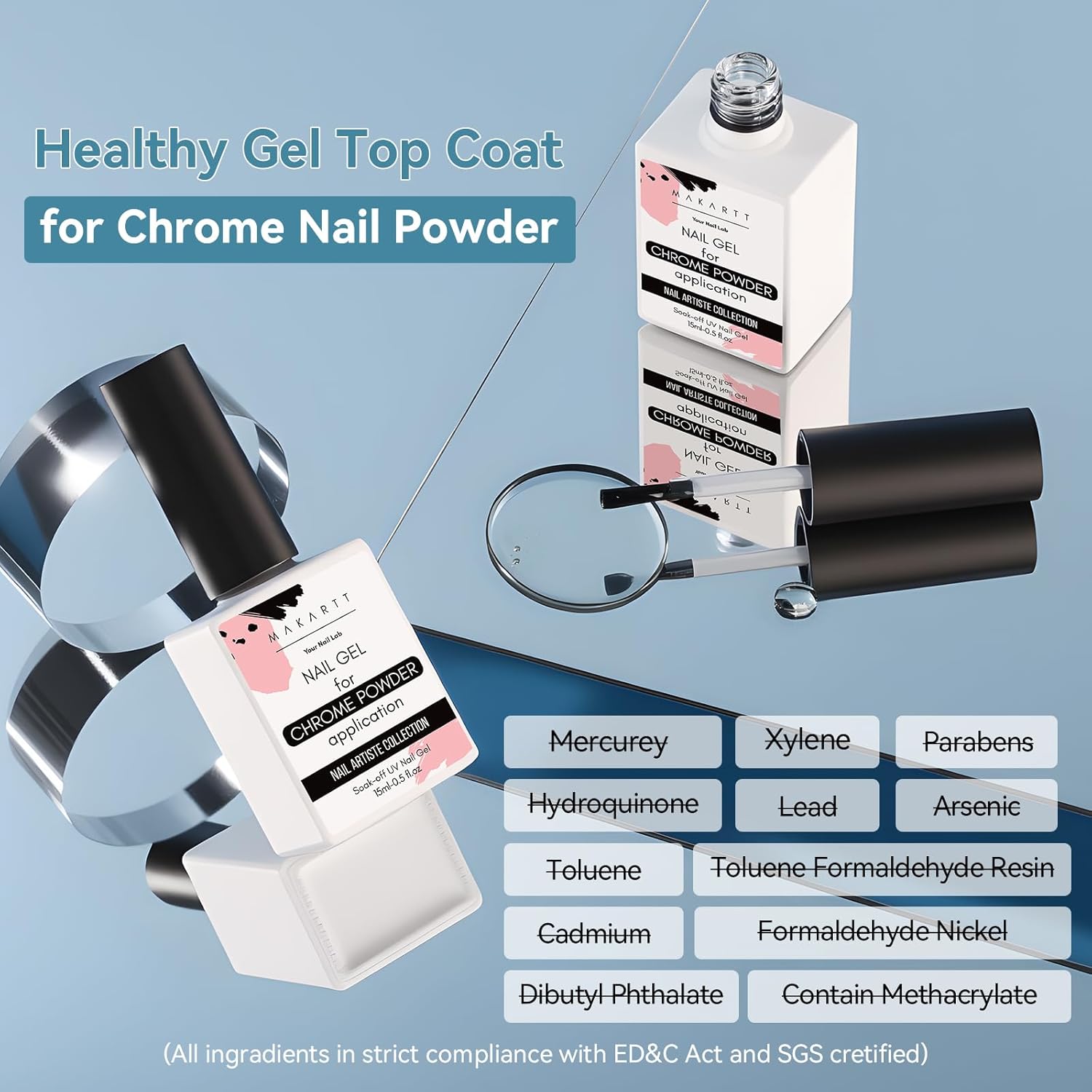 Makartt Gel Top Coat for Chrome Nail Powder - 2 Pcs 15ml Clear No Wipe High Gloss Top Coat Gel Nail Polish Mirror Shine Long Lasting Easy Application, Soak off UV Lamp, DIY Home Salon Art Design