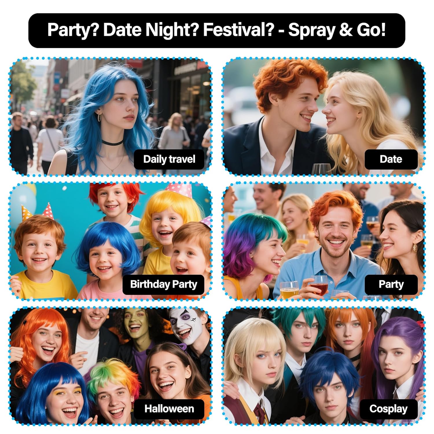 - 5. Perfect for Parties & Cosplay Halloween, raves, or everyday fun! Glow under UV lights or rock pastel pink, electric blue, or fiery red—washable hair Spray for limitless creativity!