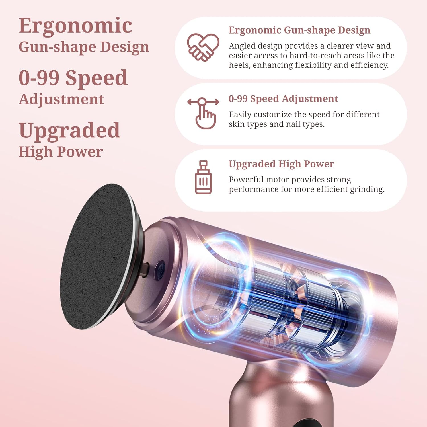 - [0-99 Speeds & High Power] -PELCAS Electric Foot File can adjust the speed from 0 - 99 levels, allowing you to easily customize the speed according to different skin types and nail types. The powerful motor provides strong performance for more efficient grinding. High-speed and stable rotation ensures smooth operation and is not easy to stall, making foot care easier and more effective. At the same time, it makes nail polishing more even, delicate and controllable.