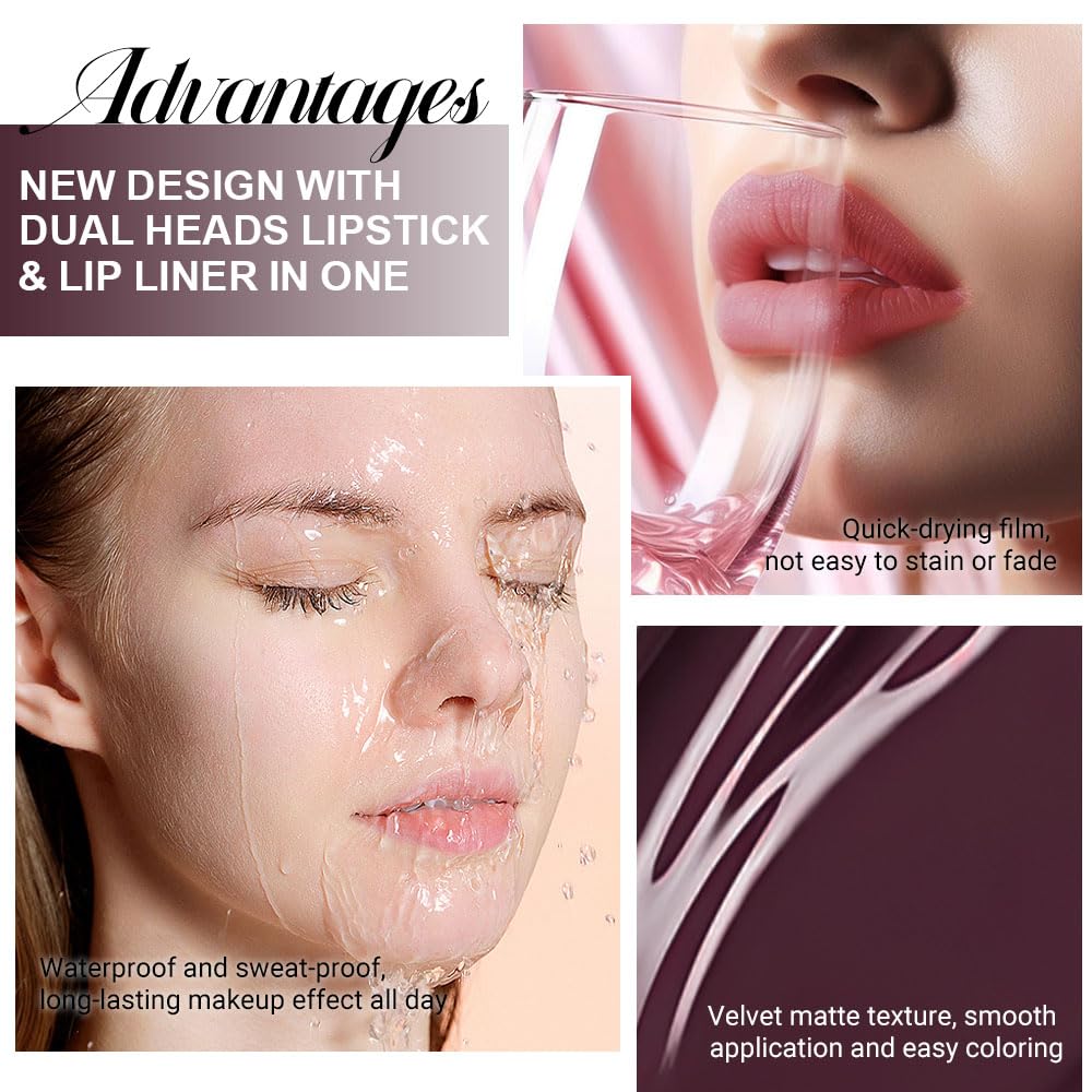 - 2 IN 1 Lip Liner & Matte Liquid Lipstick: The double ended design made you can use lipstick and lip liner on both ends. New design with dual heads lipstick & lip liner in one, for draw delicate lip line before applying lipstick. It combines lip line and metallic lipstick and makes double-end lipstick more perfect,meets the need of all occasions.