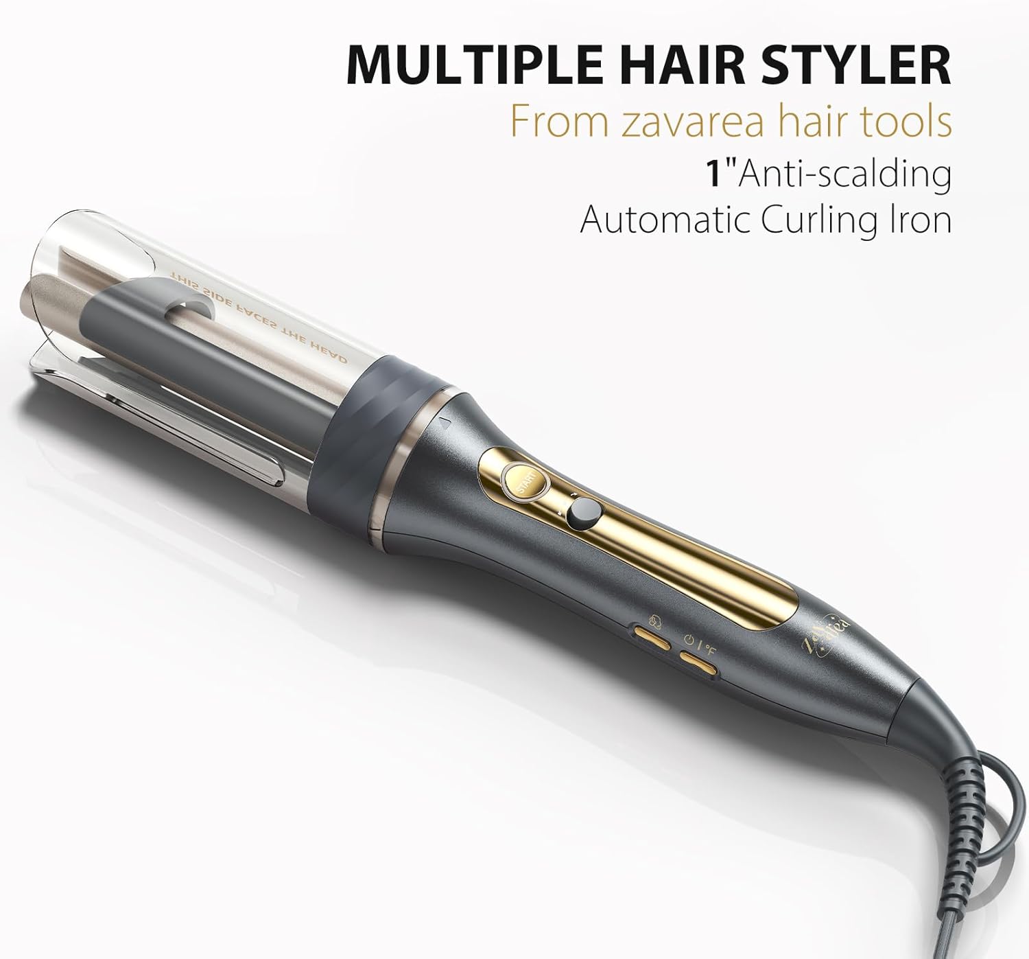 Zavarea Automatic Curling Iron, 1 Inch Hair Curler with 5 Temperatures, 3-Ways Rotation & 3-Styling Modes, Anti-Scald & Tangle-Free Self Rotating Curling Wand, Makes Hair Smoother & Shiner (Gray)