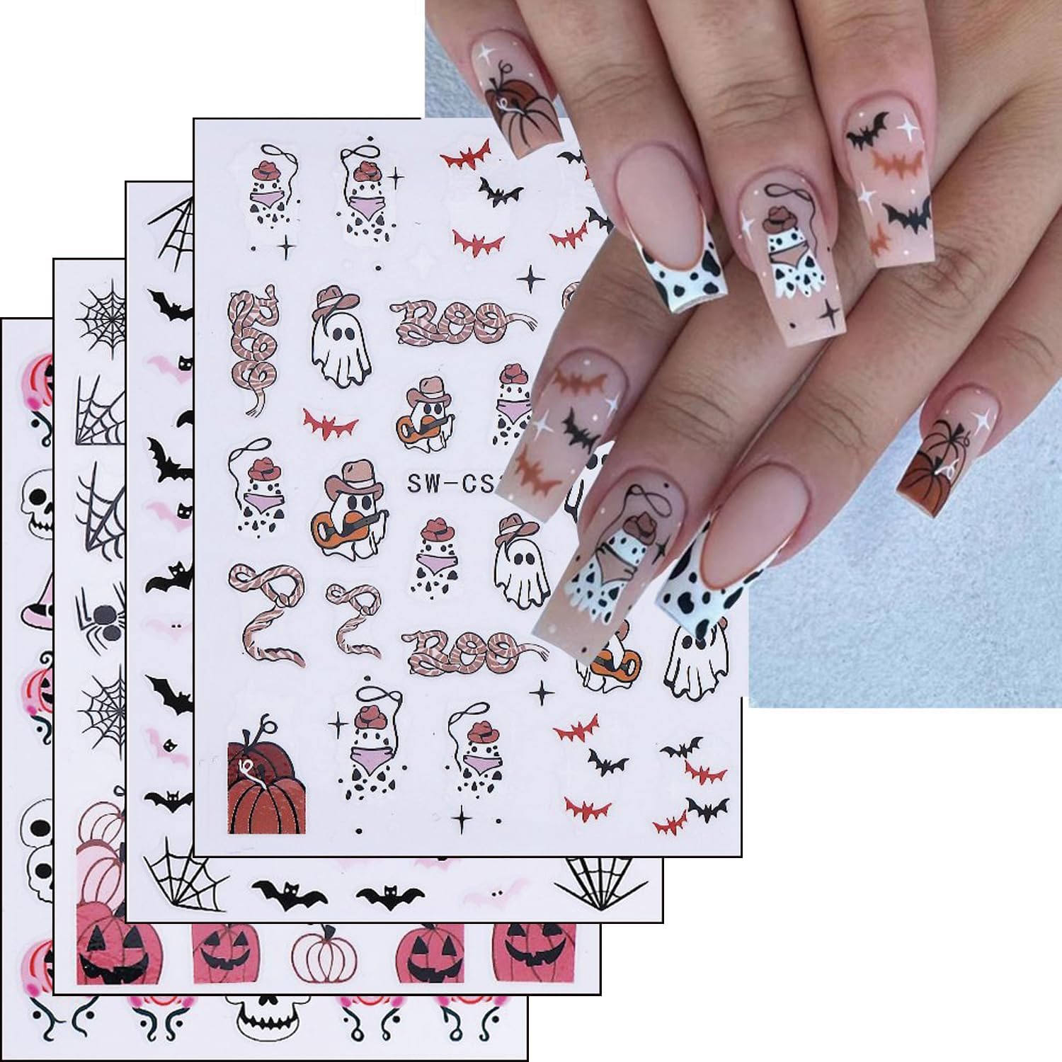 Halloween Nails Stickers Black Bat Nails Sticker 3D Embossed Pink Bats Self Adhesive Sticker Nail Decals Cute White Ghost Nail Art Decals Halloween Decals for Nail DIY Manicure 4Sheet