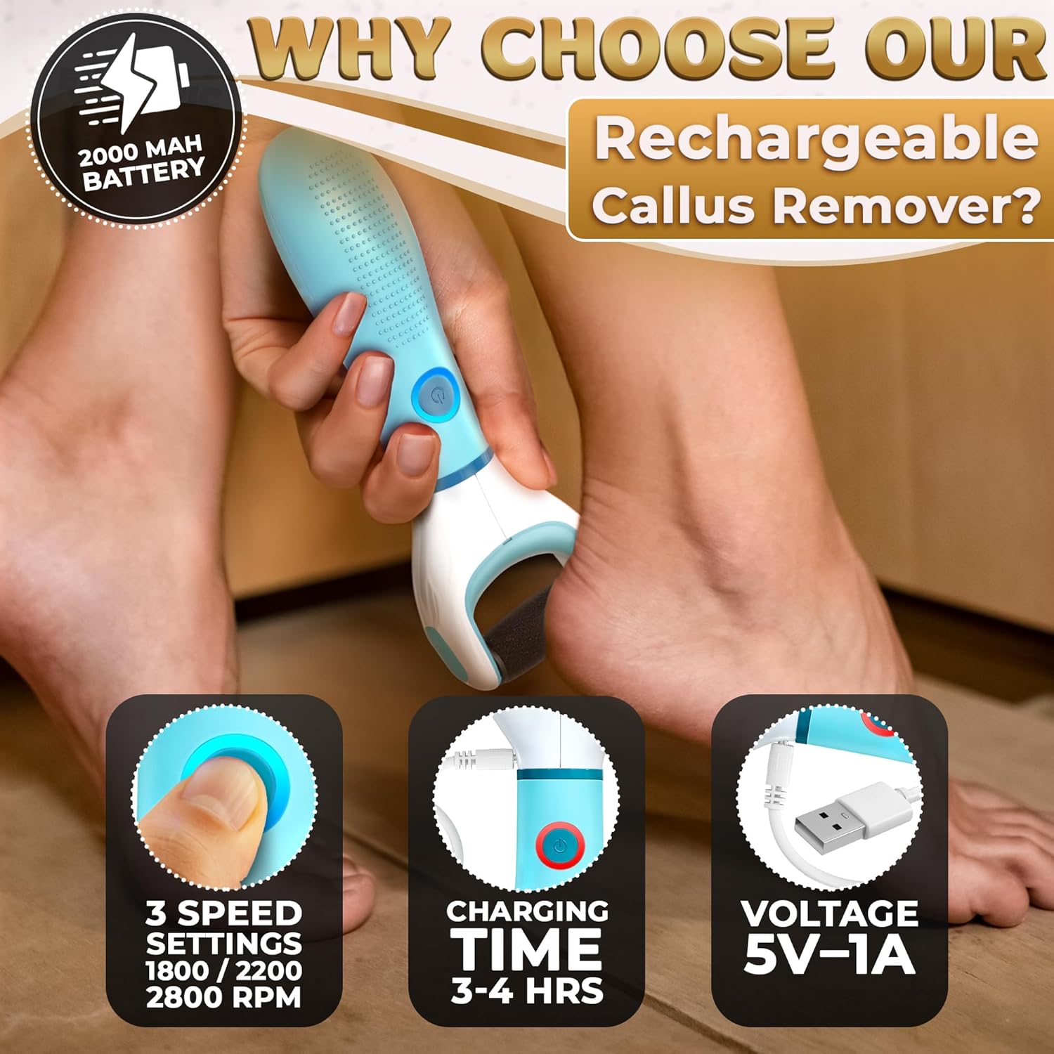 USB Rechargeable Electric Foot Callus Remover Tool – 3-Speed Foot Sanders for Feet (1800/2200/2800 RPM) with Replaceable Roller | 1200mAh, 70 Min Runtime – Pedicure Tools for Feet Smoothing