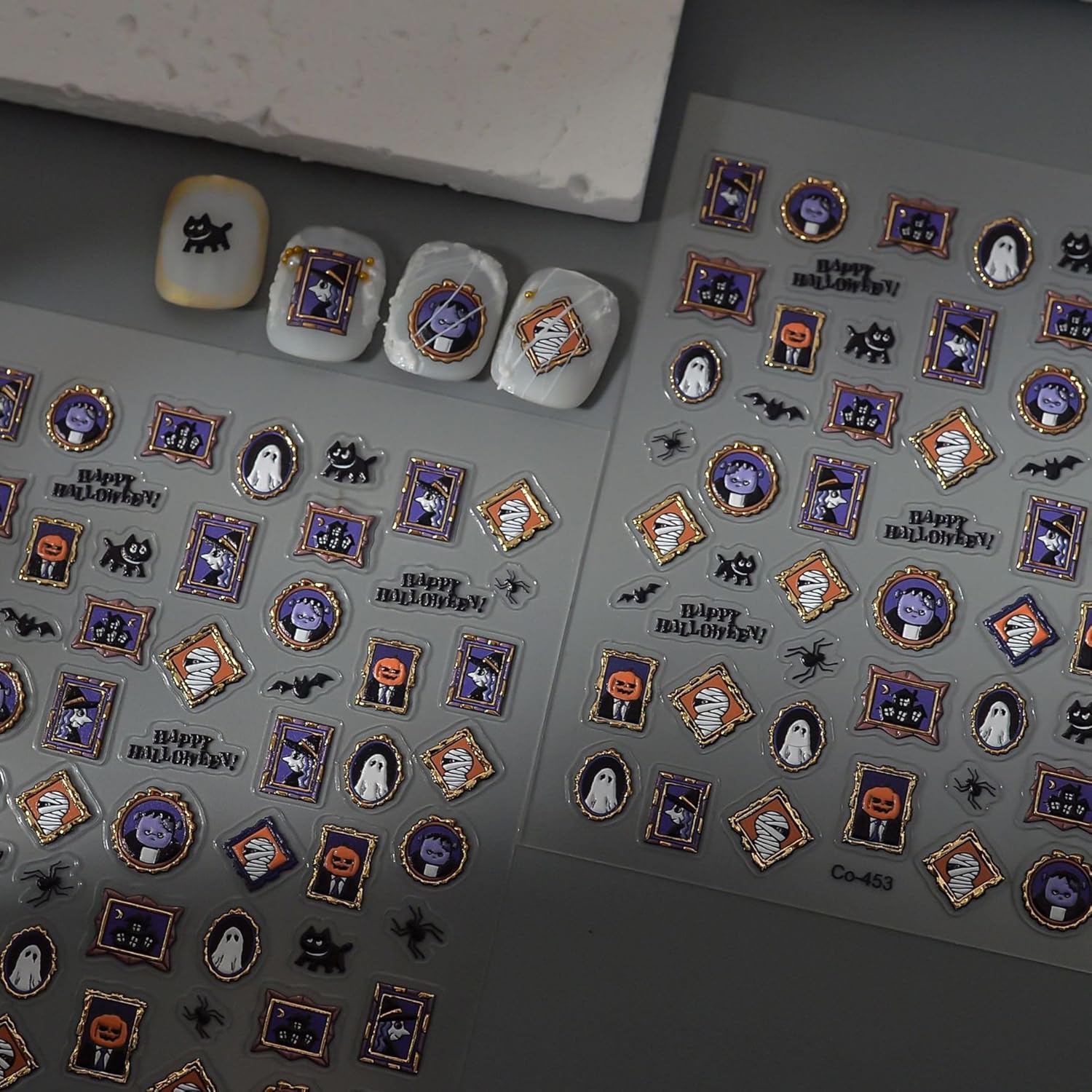 Halloween Nails Stickers Ghost with Frame Nails Sticker 3D Embossed Purple Mummy Self Adhesive Sticker Nail Decals Black Bat Nail Art Decal Halloween Decals for Nail DIY Manicure 1Sheet
