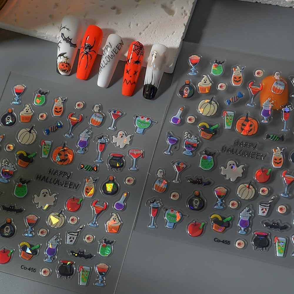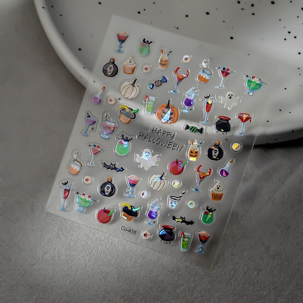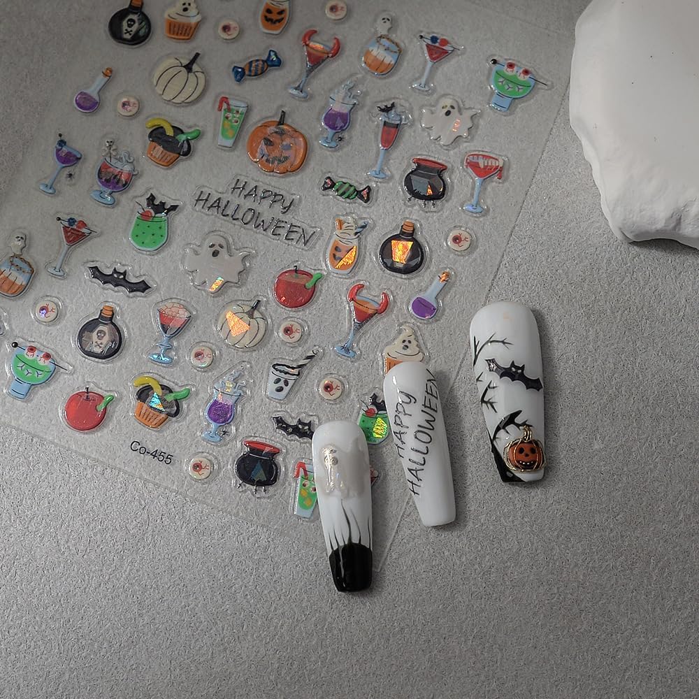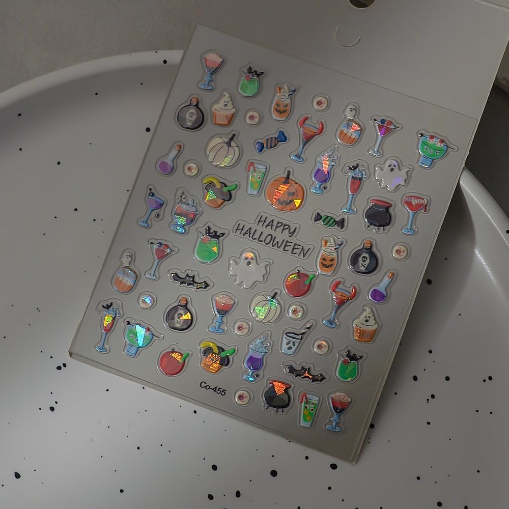 Halloween Nails Stickers Laser Ghost Nails Sticker 3D Embossed Horrible Pumpkin Self Adhesive Sticker Nail Decals Funny Glasses Nail Art Decal Halloween Decals for Nail DIY Manicure 1Sheet